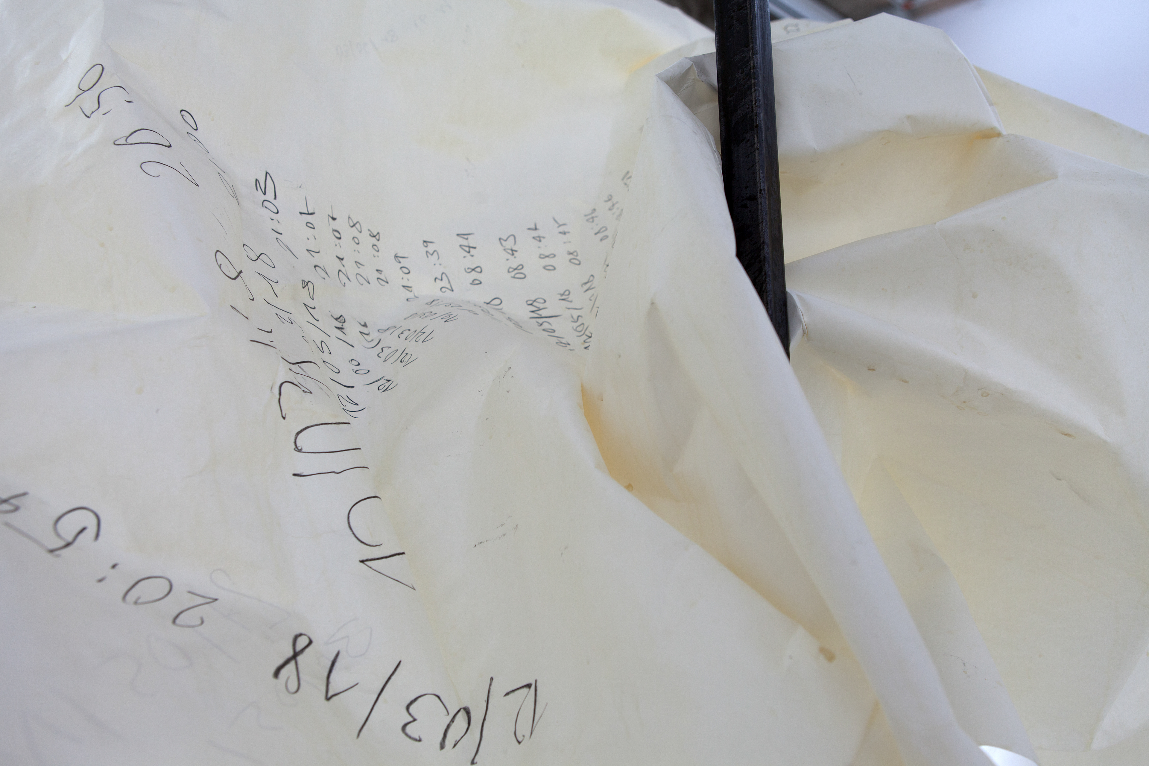 Die Papierinstallation trägt die Daten und Zeiten der Fotos, die in das Buch „hello, you got pig“, 2018 eingebunden sind. Die Fotos wurden automatisch von einer Wildkamera mit Bewegungssnsor aufgenommen.