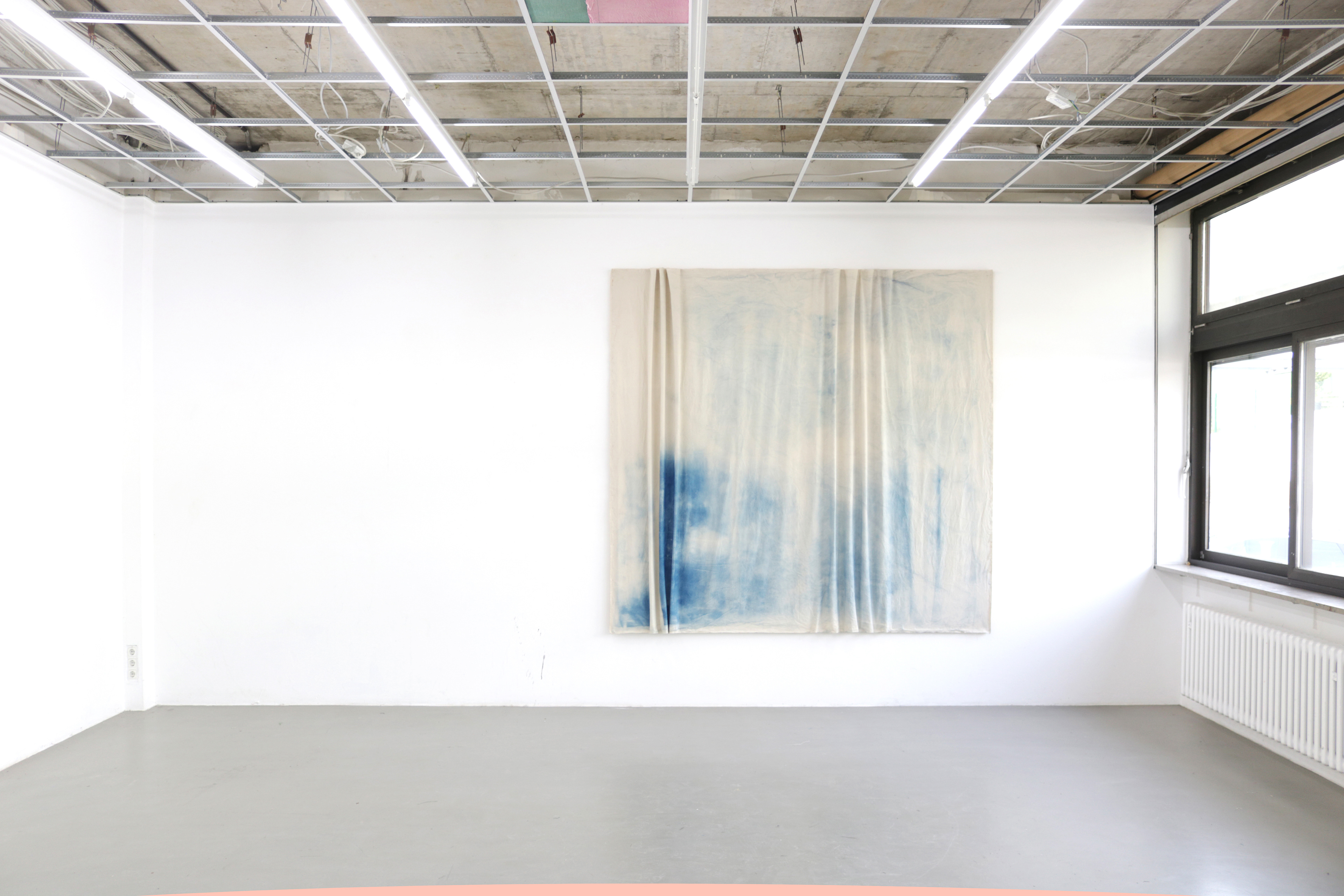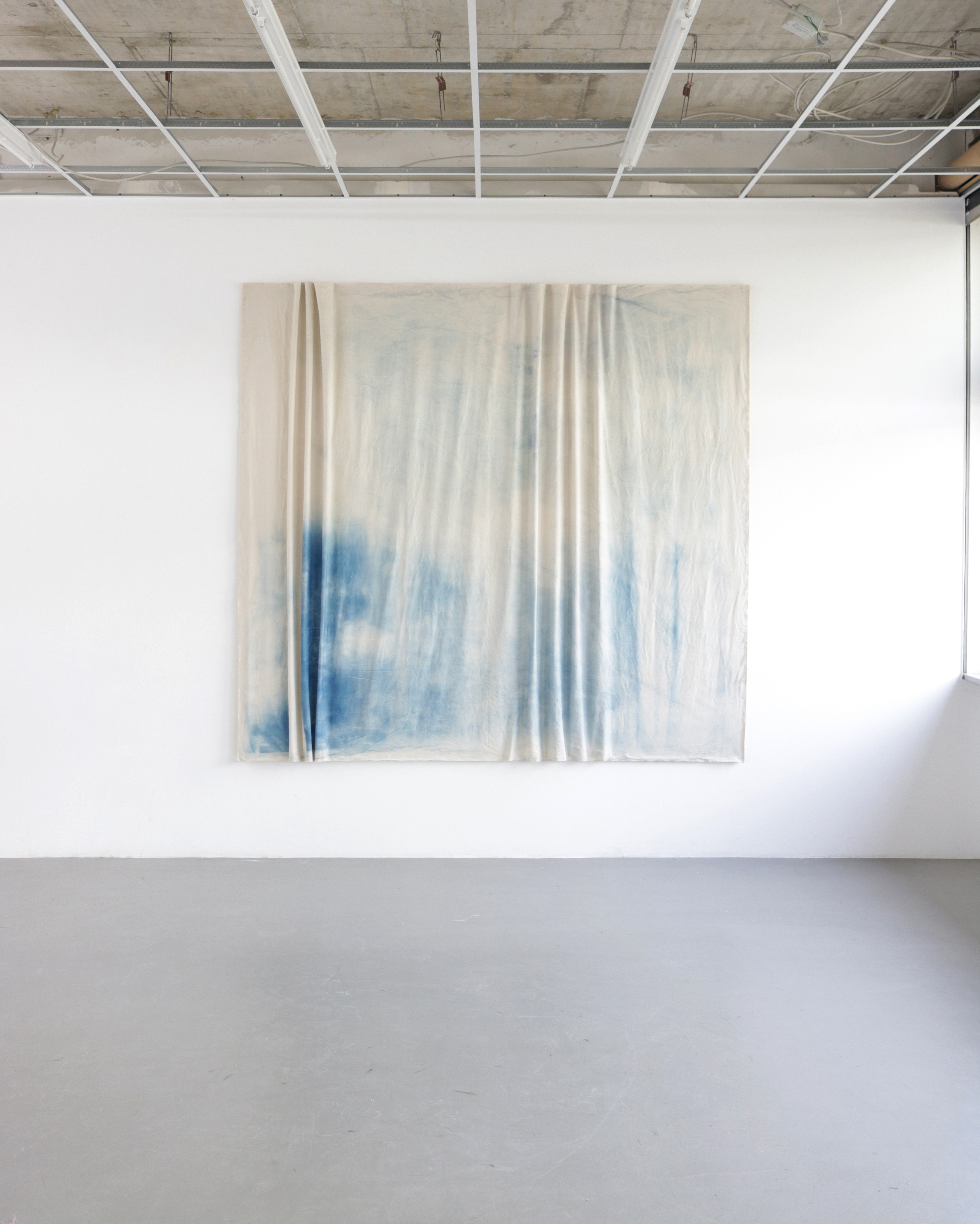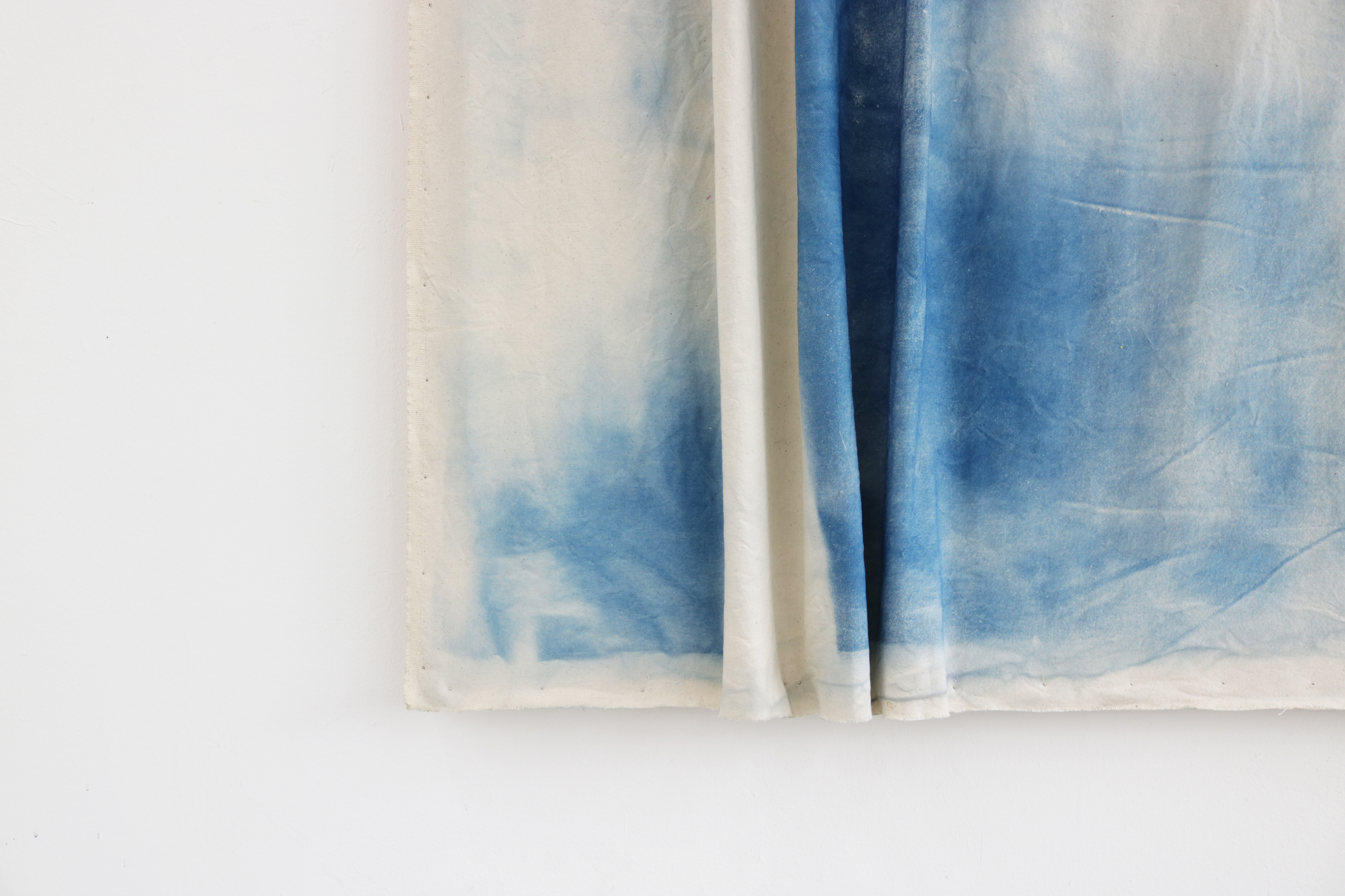 Sitting on my window board, 2020, Cyanotypie auf Baumwolle, Keilrahmen, Nägel, 235 x 245