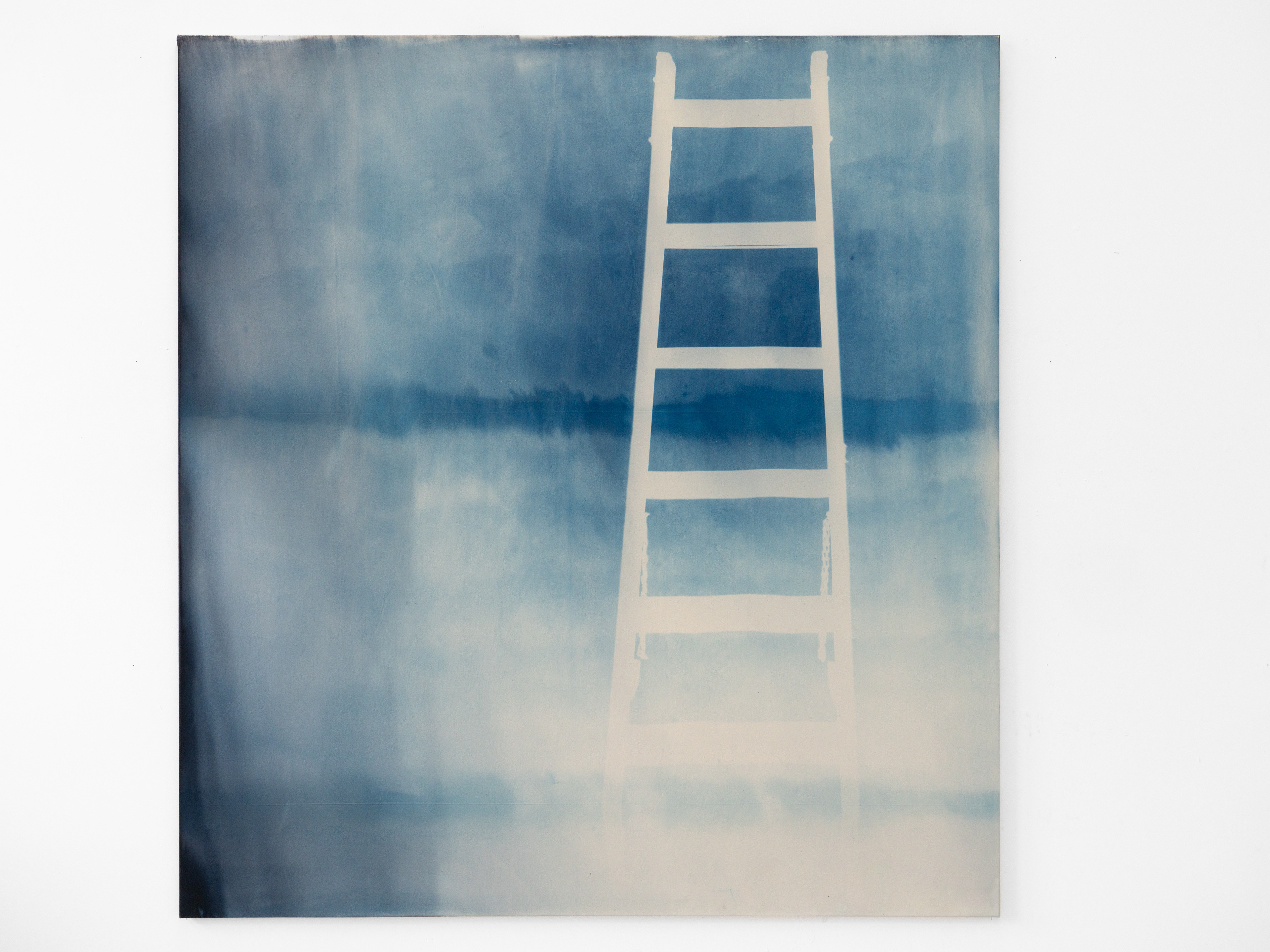 „Die Arbeit Status Quo aus dem Jahr 2025 ist eine großformatige Cyanotypie auf Leinwand im Format 210 x 195 cm. Sie zeigt den Schattenwurf einer Leiter, die an die Außenfassade der Jesuitenkirche in Aschaffenburg gelehnt ist. Die Leiter selbst ist nicht sichtbar. Was bleibt, ist ihre Spur. (...) Inhaltlich bezieht sich die Arbeit auf die sogenannte unbewegliche Leiter an der Grabeskirche in Jerusalem. Dieses Objekt steht seit dem 18. Jahrhundert unverändert an seinem Platz, da keine der beteiligten Konfessionen sie ohne Zustimmung aller anderen versetzen darf. Aus einem alltäglichen Gebrauchsgegenstand wurde so ein Symbol für Stillstand, Machtverhältnisse und zugleich für ein empfindliches Gleichgewicht. Röbke überträgt dieses Motiv in einen lokalen und zeitgenössischen Kontext. (...) Status Quo eröffnet einen symbolischen Raum, der Fragen nach Wachstum, Wandel und Koexistenz stellt, ohne eindeutige Antworten zu geben.“